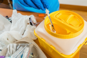 • Sharp Waste: Needles, syringes, scalpels, blades, and broken glass.